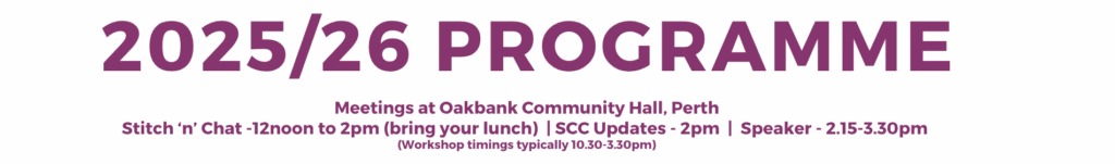 There is an opportunity to stitch and chat with other members between 12 and 2 followed by our speaker from 2-3.30pm. Two of the meetings are full day workshops, these book up quickly and are open only to members.