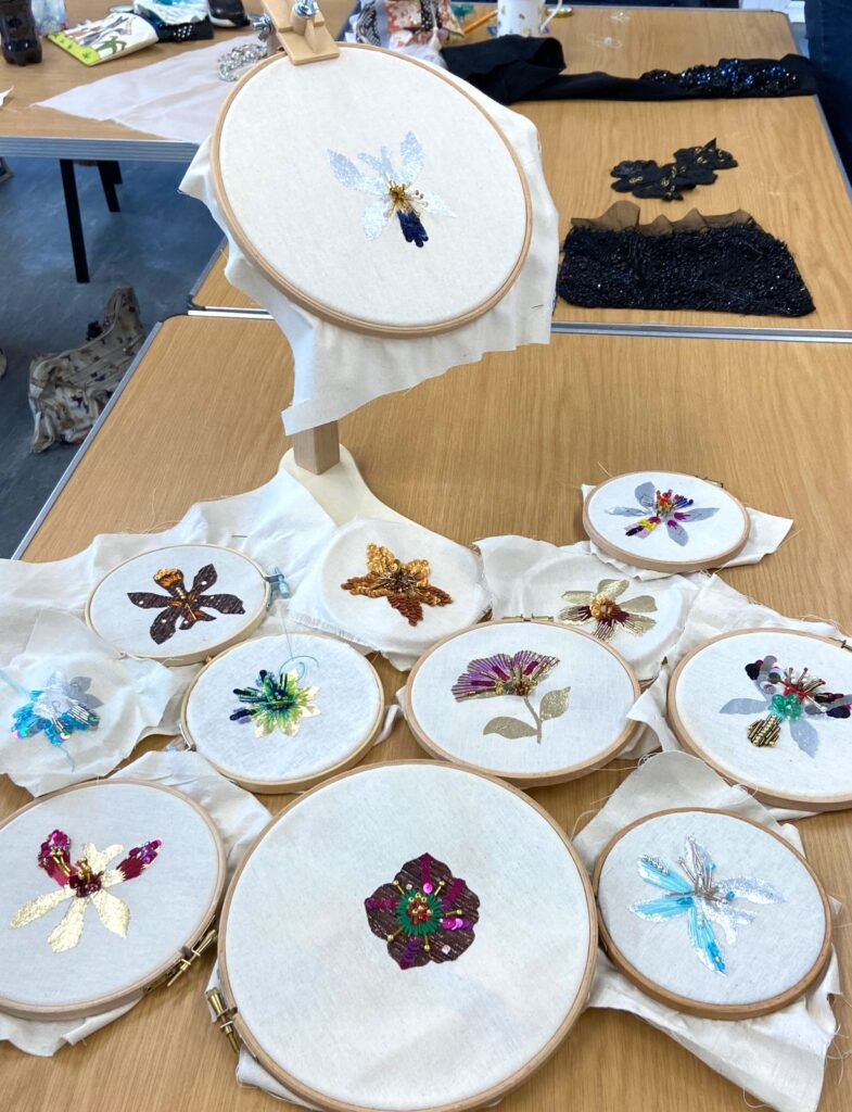 She then guided us through the essentials of hand embroidery & beading techniques incorporating threads, wools (long and short / painterly stitch), beads and sequins (sewing beads: seed and bugle, sewing 3D beads and 3D sequins). Members created an inspiring and diverse range of personalised embroidered motifs and learned techniques to use in future pieces of work.