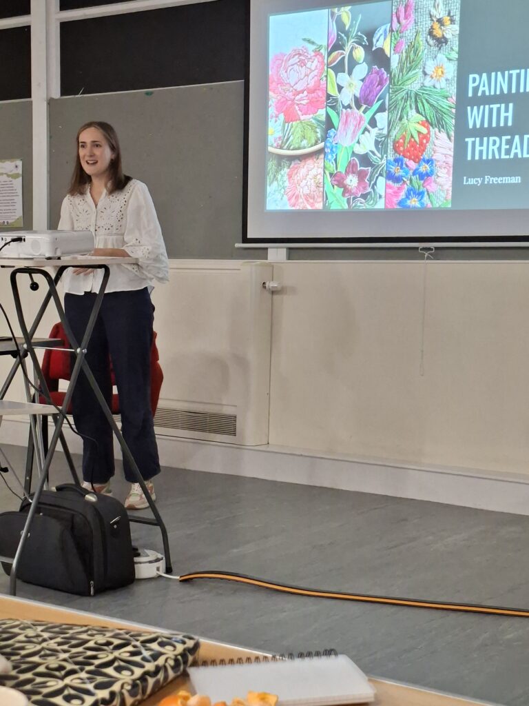 We had another busy meeting in November with 30 members joining us at Oakbank for a very informative and inspiring day. Our chair Ali Currie gave an informal demonstration of the traditional approach to silk shading techniques using long and short stitch. This was followed by Lucy Freeman’s talk ‘Painting with Thread’ . Lucy shared how she had developed her own style of thread painting and we were able to see several beautiful examples of her work. She very generously shared many hints and tips to encourage and inspire members to try the technique for themselves. Her website provides more details and the option to buy her kits.
